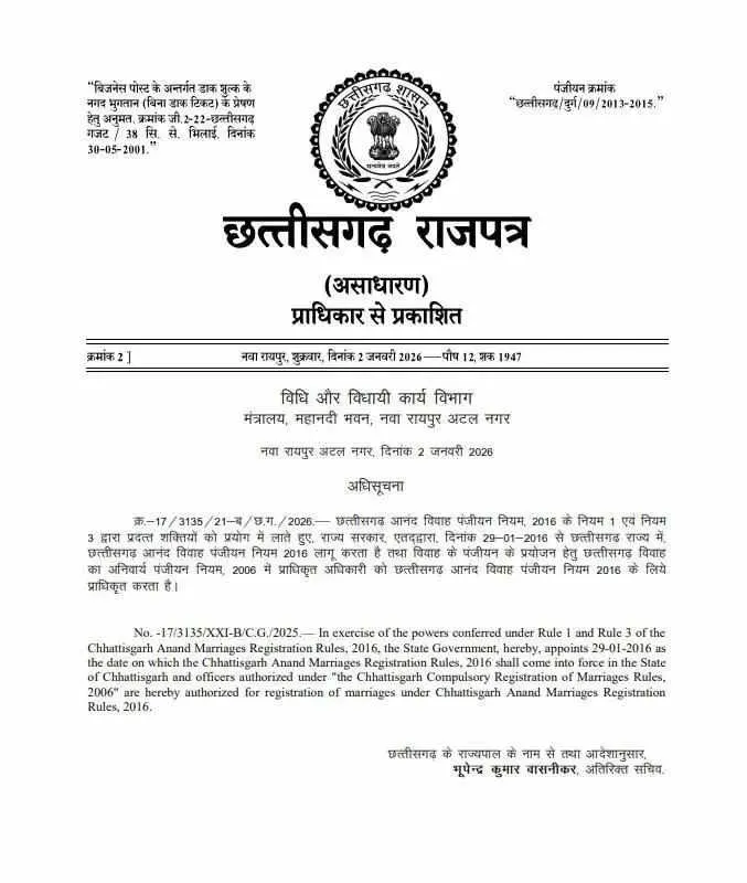 जारी अधिसूचना के अनुसार, ‘छत्तीसगढ़ आनंद विवाह पंजीयन नियम, 2016’ की शक्तियों का प्रयोग करते हुए राज्य सरकार ने यह स्पष्ट किया है कि प्रदेश में अब विवाह का पंजीकरण कराना कानूनी रूप से जरूरी होगा। राजपत्र के मुताबिक, विवाहों के सुचारू पंजीकरण के लिए उन अधिकारियों को अधिकृत किया गया है जो ‘छत्तीसगढ़ विवाह का अनिवार्य पंजीयन नियम, 2006’ के तहत पहले से कार्यरत हैं।