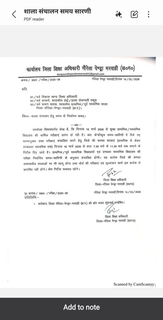 बता दें कि, ये आदेश प्राथमिक से लेकर उच्चतर माध्यमिक तक की कक्षाओं के लिए है। इसमें शासकीय और अशासकीय दोनों तरह के स्कूल शामिल हैं। इस संबंध में आदेश सभी विकासखंड शिक्षा अधिकारियों, शासकीय हाई और हायर सेकेंडरी स्कूलों के प्राचार्यों तथा प्राथमिक और पूर्व माध्यमिक स्कूलों के प्रधान पाठकों को भेज दिया गया है।