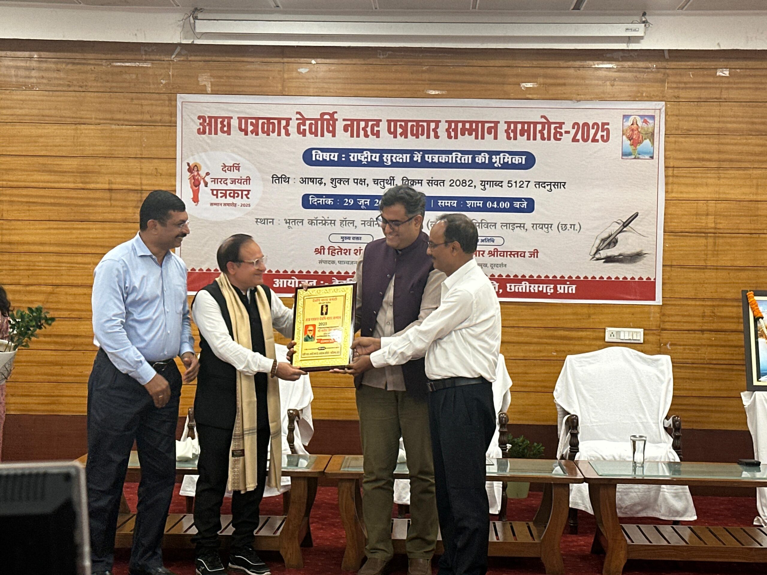 रायपुर। देवर्षि नारद केवल एक पौराणिक चरित्र नहीं, बल्कि संवाद और सूचना के आदर्श हैं। वे देवताओं और असुरों दोनों से संवाद करते थे और उनकी बातों पर हर वर्ग भरोसा करता था। आज की पत्रकारिता में यह भरोसा और संतुलन खो गया है ऐसा कहना है पाञ्चजन्य के संपादक हितेश शंकर का। दरअसल राजधानी स्थित सिविल लाइंस के नवीन विश्राम गृह में देवर्षि नारद जयंती के उपलक्ष्य में एक विशेष संगोष्ठी का आयोजन किया गया। संगोष्ठी का विषय था – “राष्ट्रीय सुरक्षा में पत्रकारिता की भूमिका”। इस अवसर पर मीडिया जगत के प्रख्यात हस्तियों ने राष्ट्रीय विमर्श में पत्रकारिता की भूमिका और उसकी विश्वसनीयता पर गंभीर चर्चा की। आयोजन का नेतृत्व देवर्षि नारद जयंती आयोजन समिति, छत्तीसगढ़ प्रांत ने किया। कार्यक्रम में पाञ्चजन्य के संपादक हितेश शंकर (नई दिल्ली) मुख्य वक्ता के रूप में उपस्थित रहे, जबकि दूरदर्शन के कार्यक्रम प्रमुख प्रदीप कुमार श्रीवास्तव ने मुख्य अतिथि के रूप में अपने विचार रखे।