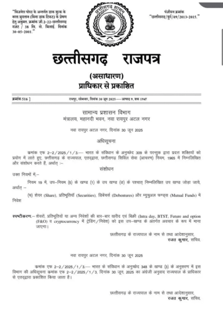 रायपुर, सामान्य प्रशासन विभाग ने छत्तीसगढ़ सिविल सेवा (आचरण) नियम, 1965 में संशोधन अधिसूचित किया है, जिसके तहत भारत सरकार के प्रावधानों की तर्ज पर अब राज्य के शासकीय सेवकों को शेयर (Shares), प्रतिभूतियों (Securities), डिबेंचर्स (Debentures) और म्युचुअल फंड्स (Mutual Funds) में निवेश की अनुमति दी गई है।