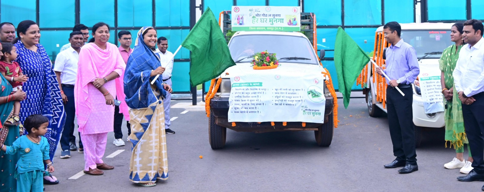 रायपुर। महिला एवं बाल विकास मंत्री श्रीमती लक्ष्मी राजवाड़े ने अपने नवा रायपुर स्थित निवास से मोर गोठ ल सुनगा, हर घर मुनगा अभियान का शुभारंभ किया। कार्यक्रम के तहत मंत्री श्रीमती राजवाड़े ने प्रचार वाहन को हरी झंडी दिखाकर रवाना किया और मुनगा (सहजन) का पौधारोपण कर अभियान की विधिवत शुरुआत की। उन्होंने कहा कि मुनगा न केवल एक पौष्टिक सब्जी है, बल्कि यह बच्चों और माताओं के पोषण स्तर को सुधारने में अहम भूमिका निभाएगा। मंत्री श्रीमती राजवाड़े ने इस पहल को जन-आंदोलन में बदलने की अपील की.