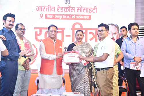 इस अवसर पर मुख्यमंत्री श्री विष्णु देव साय ने कैम्प कार्यालय बगिया में आयोजित कार्यक्रम में भारतीय रेडक्रॉस सोसायटी जशपुर के आजीवन सदस्यों को प्रमाण पत्र वितरित किए और “रक्त-मित्र” पुस्तिका का विमोचन किया। इस दौरान उन्होंने श्री नीरज शर्मा, श्री अजय कुमार कुशवाहा और श्री शिव नारायण सोनी को प्रमाण पत्र प्रदान कर उनके योगदान की सराहना की।