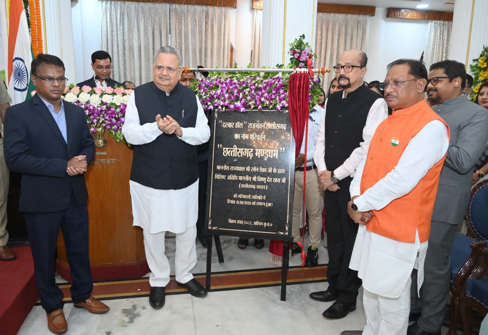 रायपुर-/राजभवन के दरबार हॉल का नाम परिवर्तन कर ‘छत्तीसगढ़ मण्डपम’ किया गया है। राज्यपाल श्री रमेन डेका ने आज स्वतंत्रता दिवस के अवसर पर दरबार हॉल का नाम परिवर्तन कर छत्तीसगढ़ मण्डपम करने की घोषणा की एवं इसका विधिवत अनावरण किया। इस अवसर पर विशिष्ट अतिथि मुख्यमंत्री श्री विष्णुदेव साय, विधानसभा अध्यक्ष डॉ. रमन सिंह, उप मुख्यमंत्री श्री विजय शर्मा, खेलकूद एवं युवक कल्याण मंत्री श्री टंकराम वर्मा सांसद श्री बृजमोहन अग्रवाल एवं अन्य जनप्रतिनिधि मुख्य सचिव श्री अमिताभ जैन, डीजीपी श्री अरूण देव गौतम तथा अन्य वरिष्ठ अधिकारीगण एवं गणमान्य नागरिक उपस्थित थे।