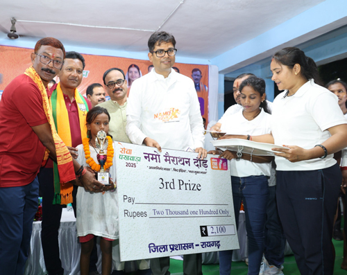 वित्त मंत्री श्री ओ.पी.चौधरी ने नमो मैराथन दौड़ के समापन में विजयी प्रतिभागियों को पुरस्कृत किया। इनमें पुरूष वर्ग में प्रथम स्थान पर मनोज कुमार यादव, द्वितीय-भोजराम साहू एवं तृतीय स्थान पर सुनील कुमार साहू रहे। इसी तरह महिला वर्ग में प्रथम स्थान पर सोना चौहान, द्वितीय-संगीता यादव एवं तृतीय स्थान पर धनकुवर सिदार रही। प्रथम आने वाले प्रत्येक प्रतिभागी को 5100 रूपए, द्वितीय को 3100 रुपए एवं तृतीय स्थान पर रहे प्रतिभागियों को 2100 रुपए दिए गए। बालक और बालिका वर्ग से प्रथम दस स्थानों पर आने वाले प्रतिभागियों को वित्त मंत्री श्री ओ.पी.चौधरी ने 5-5 हजार रूपये देने की घोषणा भी की।