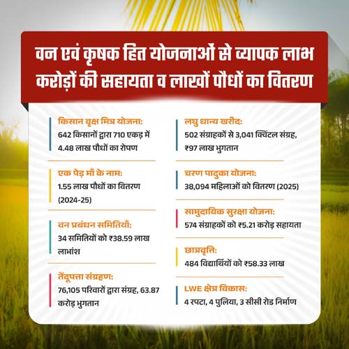 किसान वृक्ष मित्र योजना के अंतर्गत 642 कृषकों ने अपनी 710 एकड़ राजस्व भूमि पर कुल 4 लाख 48 हजार 220 पौधों का रोपण किया। इस योजना ने किसानों को वृक्षारोपण के माध्यम से अतिरिक्त आय का अवसर दिया और खेतों में हरियाली का विस्तार भी किया। इसी प्रकार एक पेड़ माँ के नाम पहल के तहत मातृत्व के सम्मान में 1 लाख 55 हजार 44 पौधों का वितरण किया गया, जिसने समाज में पर्यावरण संरक्षण के साथ भावनात्मक जुड़ाव का नया संदेश दिया।